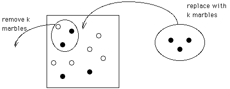 Key assumption: For each reinforcement, k marbles are randomly sampled and replaced with k red marbles. Because the marbles are randomly sampled, the replaced marbles contain some red and some white. The number of red marbles on trial n is therefore equal to the previous number, minus those taken out, plus k red: